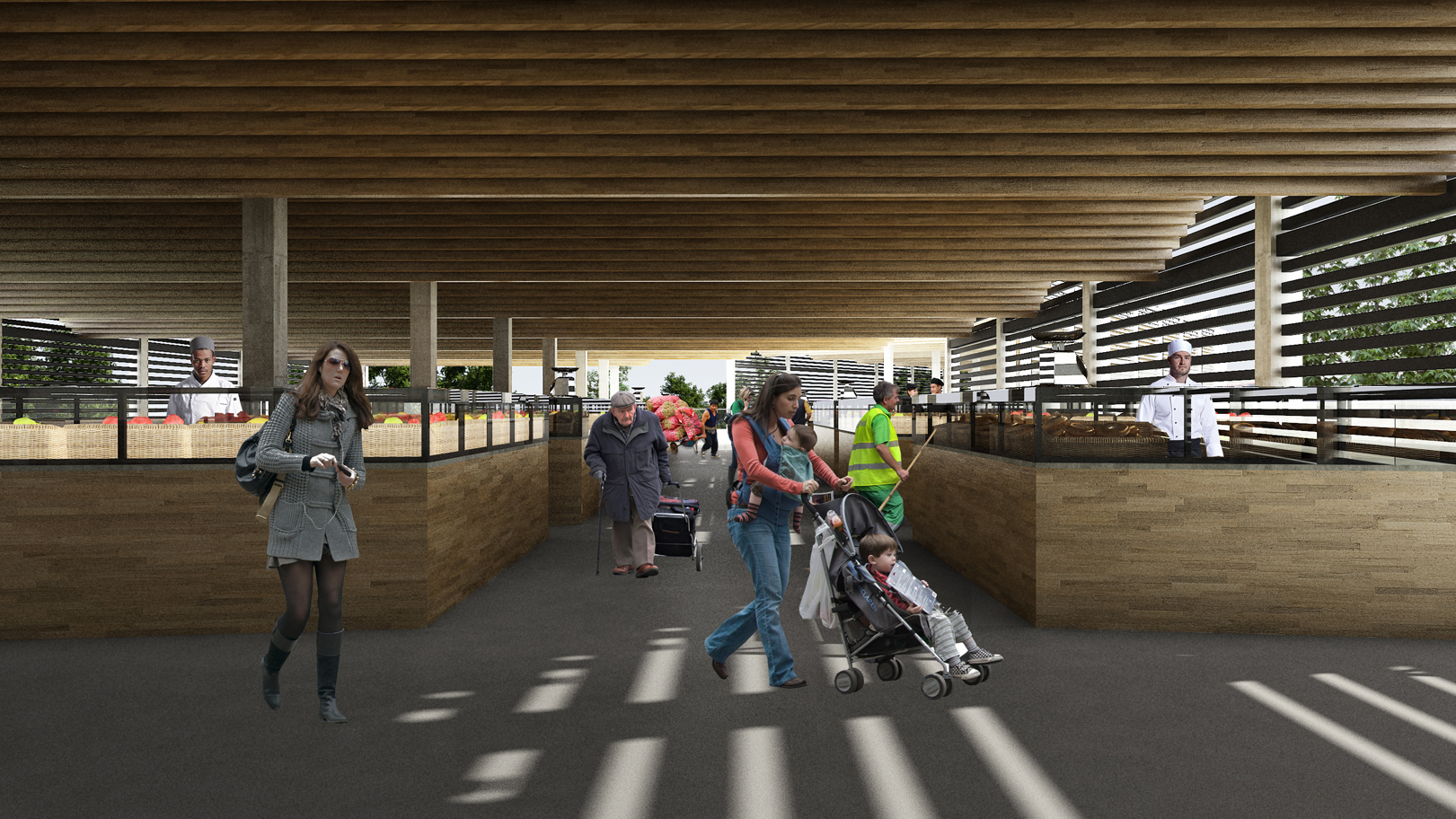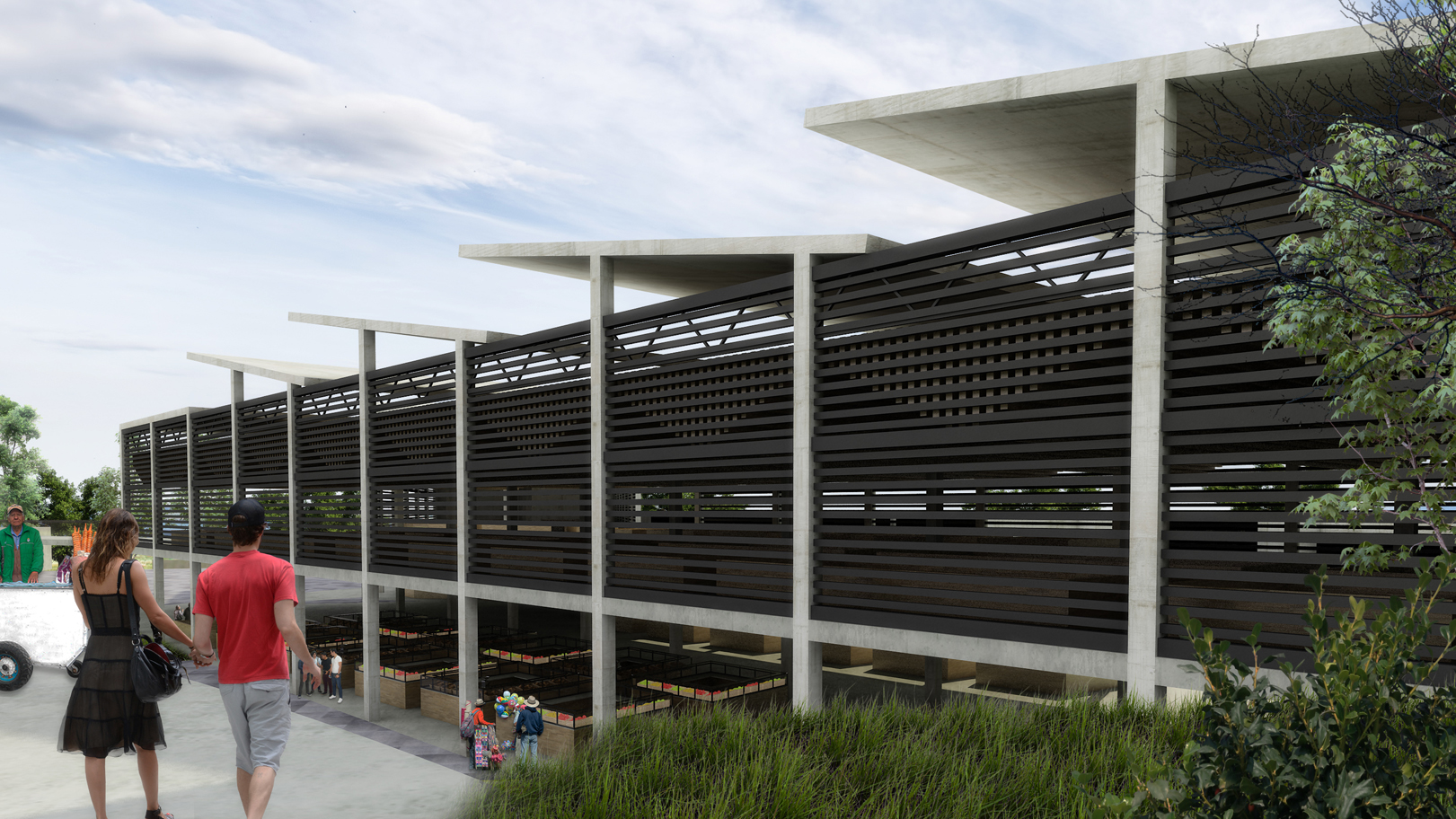 Está diseñado en varios desniveles para crear diferentes plazas, ya que ésta parte de la ciudad carece de espacios públicos.